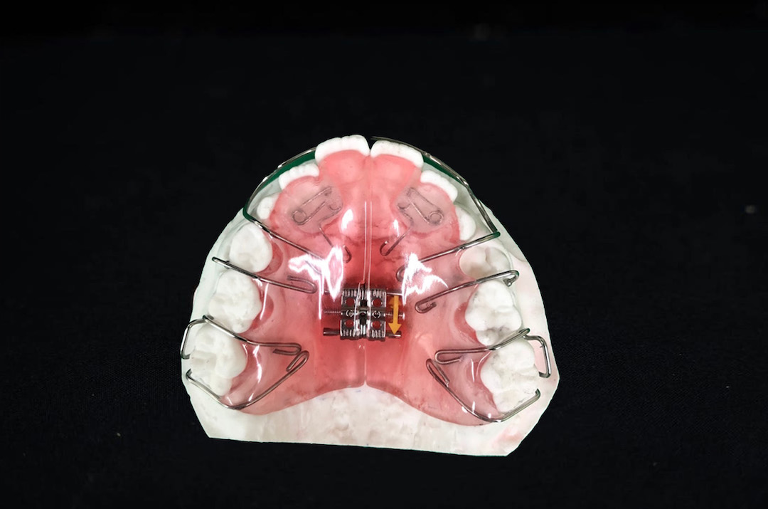 床拡大装置は、歯列を拡げるための矯正装置です。歯が並ぶスペースが足りない歯列の方に使用します。床と呼ばれるプレートの真ん中にネジが埋め込まれています。そのネジを1~2週間に1回まわし、プレートを拡げます。