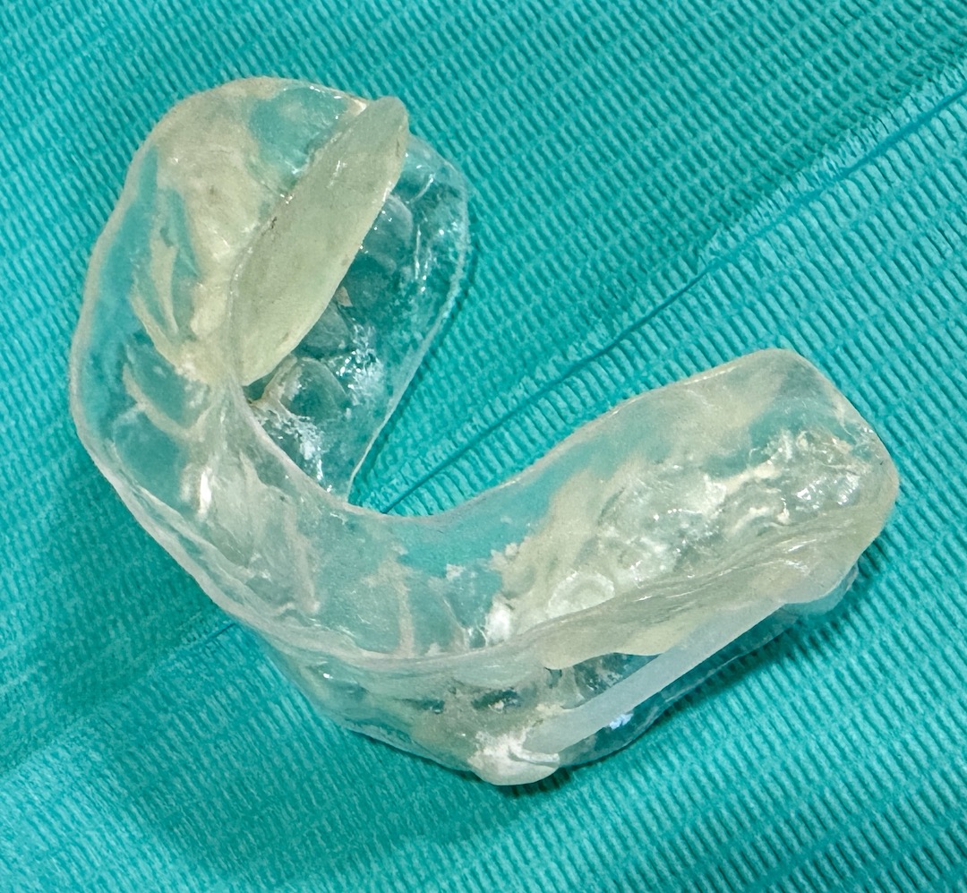 スリープスプリント療法は、上下顎のマウスピースを用いて、下顎を前に出した状態(最大前方位の60〜70%の位置)で固定し、舌の沈下を防ぐことで睡眠中の気道を確保し正常な呼吸を保つ治療です